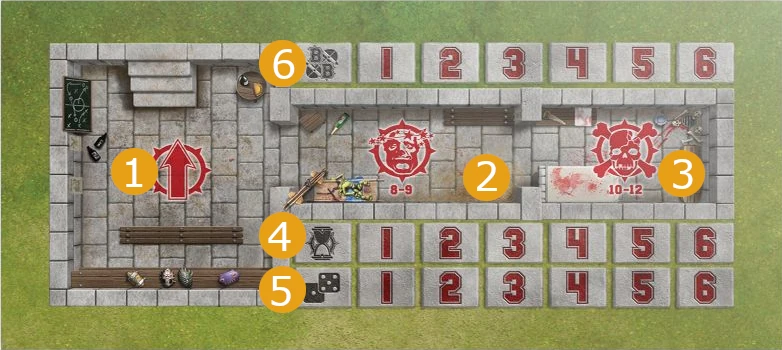 As with normal Blood Bowl, each team in a Blood Bowl Sevens game has its own dugout, a safe haven at pitch side where reserves can warm up, where the injured can be tended to and where important game information is tracked. The dugouts used for Blood Bowl Sevens are almost identical to normal dugouts, as described in the Blood Bowl rulebook, except for one important difference; on a Blood Bowl Sevens dugout, the turn and team re-roll trackers only go up to six, rather than the usual eight. This is because there are only six turs per half in a Blood Bowl Sevens game.